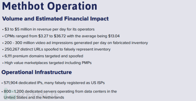虽然没有足够的证据可以证明Methbot是俄罗斯人干的,但是安全研究人员却坚定地相信这群黑客来自于俄罗斯。安全专家表示,虽然Methbot恶意广告欺诈活动的运行总部设在俄罗斯,但是Methbot的服务器(数据中心)却托管在美国德克萨斯和阿姆斯特丹的多个机房内,而这些服务器托管着超过57万个bot,相应掌控57万IP地址,这些地址绝大部分属于美国,造成的欺骗效果就是让广告网络认为大量美国访客查看了这些广告。
