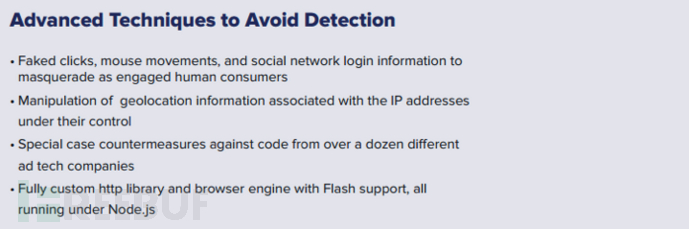 但实际上,这些视频广告全是由Methbot“机器人”观看的。攻击者使用了一款自动化软件来模拟用户观看广告的行为。为了让这些“机器人”看起来更真实一点,他们还使用了类似社交媒体登录、自动点击和鼠标移动等模拟方法。