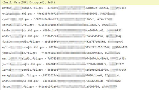 此次泄漏的数据中包括FBI.gov的用户账号信息,其中包括账号的用户名、SHA1加密的用户密码、SHA1盐值、以及用户邮箱等信息。根据安全研究专家透露的信息,CyberZeist从FBI.gov的服务器中发现了几个备份文件(acc_102016.bck、acc_112016.bck和old_acc16.bck等等),并在这些备份文件中找到了大量用户数据。