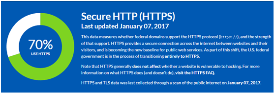 为加强政务服务平台安全、保障数据网络传输安全,英美两国均出台安全公告,强制要求政府对外公共服务网站,在2016年底前实施全站HTTPS加密。截至2017年1月7日,70%的美国政府网站实现了全站HTTPS加密。