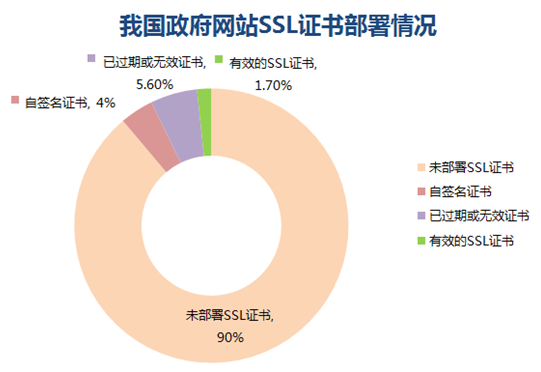 然而,目前我国政府网站的SSL证书部署情况仍然令人担忧。截至2016年7月,沃通CA针对已解析到gov.cn的68029个政府网站进行的统计分析显示,近90%的政府网站尚未部署SSL证书,4%的政府网站部署了非常不安全的自签名证书,5.6%的政府网站证书已过期或无效,仅1.7%的政府网站部署了有效的SSL证书。希望2017年底前,各级有关部门能够响应《建设指南》要求,完成网上政务服务平台建设的同时,部署HTTPS加密保障数据网络传输安全。