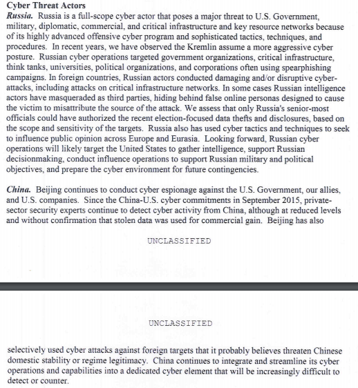 网络威胁攻击者声明提到俄罗斯、中国、伊朗、朝鲜、恐怖分子和犯罪分子都被美国列为网络威胁攻击者。