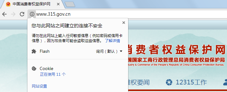 目前,全国各省市工商、消协都在积极建设完善本省市的消费者投诉渠道,特别是线上投诉平台。然而调查发现这类网站大部分未使用HTTPS加密。即便是中国消费者权益保护网和全国12315互联网平台等国家总局下属的消费者维权和信息发布平台,也因为没有部署HTTPS加密,被谷歌Chrome浏览器显示“连接不安全”的警告。