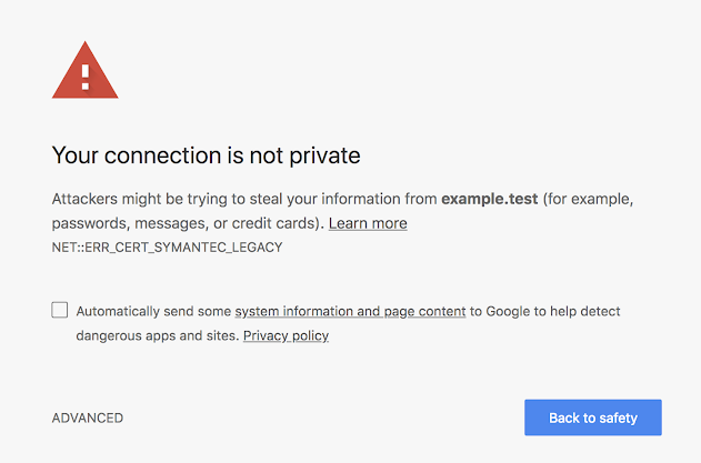 Chrome 66用户在使用2016年6月1日之前颁发的旧版赛门铁克SSL/TLS证书时可能会看到的证书错误示例