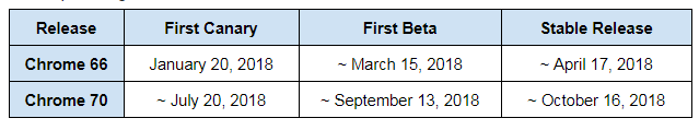 下表显示了Chrome 66和Chrome 70的第一个金丝雀版本、第一个Beta版本和稳定版本的发布时间。最初的影响从第一个金丝雀版本开始,随着该版本发布Beta版和最终的稳定版,用户人数会稳定增长。强烈建议网站运营商在Chrome 66和Chrome 70的第一个金丝雀版本之前对网站进行必要的更改,最迟不晚于相应的Beta版本发布日期。