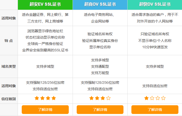发布日期:2018-08-16https证书的类型有哪几种?目前市场上全球信任的支持浏览器的 SSL证书主要有 3 种: EV SSL证书、OV SSL证书和 DV SSL证书,而WoSign对应的产品有:EV超安SSL证书、OV超真SSL证书 和 DV超快SSL证书。
