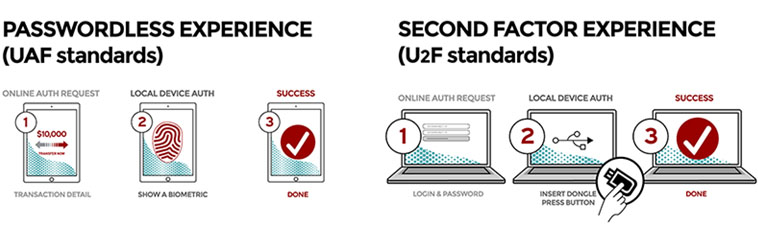 FIDO 1.0内含两种规格,分别是通用认证框架(Universal Authentication Framework,UAF)与通用第二因素认证(Universal 2nd Factor,U2F)。其中,U2F是用一个令牌(token)来做强身份认证,而UAF为利用生物辨识或其他方法来完成强身份认证,因此不再需使用密码。