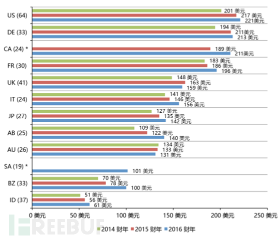 不同国家/地区样本之间的差异很显著。美国和德国的每条记录平均成本依然最高,分别为221美元和213美元。印度和巴西的成本最低,分别为61美元和100美元。
