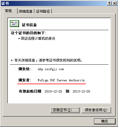 发布日期:2010-12-20深圳市住房公积金管理中心 的 网上办事大厅系统 于今日成功部署了 WoSign 品牌 SGC超真SSL证书 和 微软代码签名证书(数字签名密码控件)来保证用户公积金帐户的安全,将更好地为深圳市广大企业员工提供更加完善和更加安全的网上公积金缴存登记、查询和贷款等各种服务,真正把“执政为民”落实到了实处,实现“权力型窗口向服务型窗口”的转变,并向“更加安全的服务型窗口”转变,此举值得全国各地住房公积金系统学习,充分体现了特区创新和开拓精神。