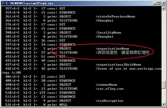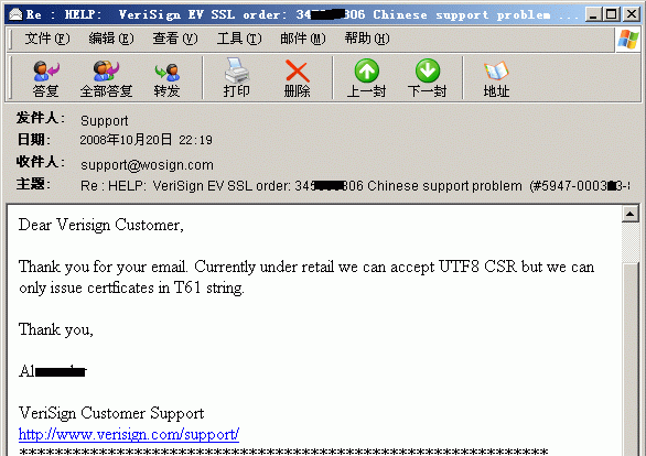 我们根据客户的要求找VeriSign技术支持,他们不认为自己的证书有问题,当我们提交了我们工程师的验证结果,如下图3所示,证明其证书不是UTF格式而是T61字符串时,他们终于承认VeriSign证书不支持UTF格式的中文,而导致无法在火狐浏览器中正常显示,如下图4所示为VeriSign Support的Email回复。