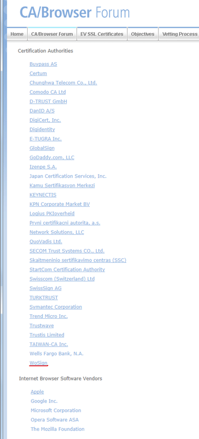 国际CA/浏览器产业联盟(CA/Browser Forum, www.cabforum.org)是制定CA国际标准的技术联盟,成员包括33家全球著名的受信任的根证书颁发机构(CA)和5家著名浏览器厂商(微软、火狐、谷歌、苹果、Opera)。WoSign(沃通)是中国唯一一家加入此国际标准组织的CA,亚太地区有5家。