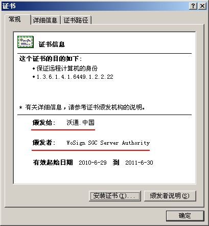 发布日期:2010-6-29WoSign(沃通) 在 6 月 26 日 通过 媒体 获悉“ .中国 域名入根国际申请已获得ICANN(互联网名称与编号分配机构)理事会表决通过,预计8月份将在全球启用”的特大喜讯后,加紧组织技术力量研发支持.中国的 SSL 证书,通过 3 天的努力攻关,于今日成功颁发全球第一个支持.中国 域名:“沃通 . 中国” 的 SSL 证书!