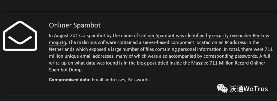 2017年8月,法国一名安全研究人员(推特账号为Benkow)表示,他获得了一份包含7.11亿条记录的spambot数据,其中包含来自全球各地的电子邮件账号、邮箱地址、密码组合(有些是明文形式)以及SMTP凭证和配置文件。这份数据已经得到HaveIbeenPwned(HIBP)确认,HIBP在博客中提到其中27%的账户已经存在于HaveIBeenPwned数据库中,主要来自先前LinkedIn、MySpace、Dropbox数据泄露事件。