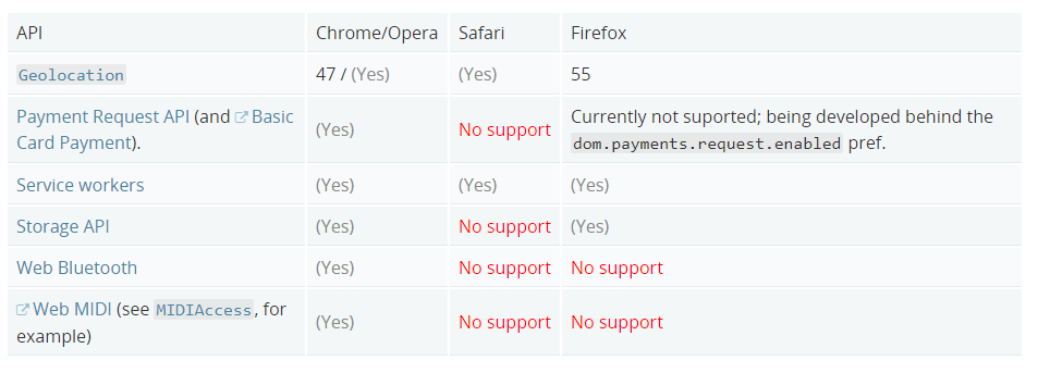 Firefox宣布高级功能仅限“安全内容”并不是个例,早在去年7月,谷歌也宣布一些仅限使用HTTPS加密的Chrome功能。下图为目前仅限“安全内容”的浏览器高级功能列表。