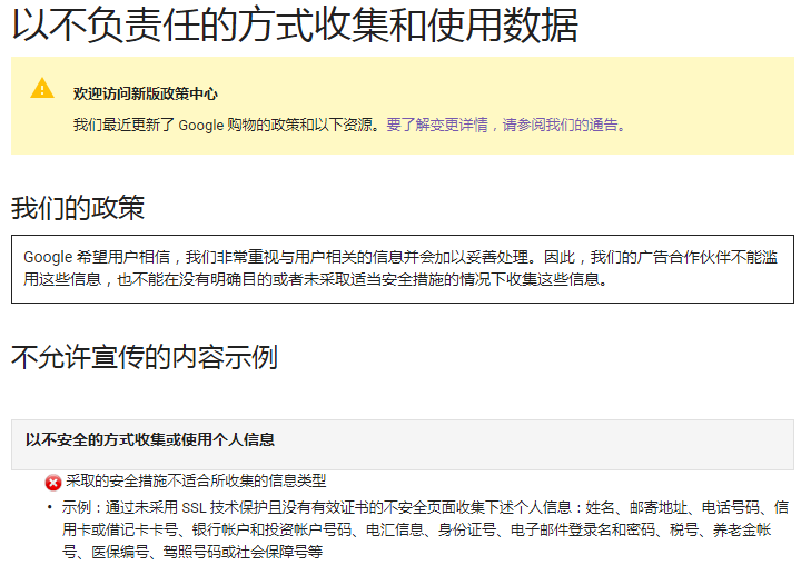 谷歌在2016年更新了Google Shopping 政策,“以不负责任的方式收集和使用数据”将被认定为违规。比如:通过“未使用SSL技术且没有有效证书”的不安全页面,收集下述个人信息:姓名、邮寄地址、电话号码、信用卡或借记卡卡号、银行帐户和投资帐户号码、电汇信息、身份证号、电子邮件登录名和密码、税号、养老金帐号、医保编号、驾照号码或社会保障号等都被视为违规。