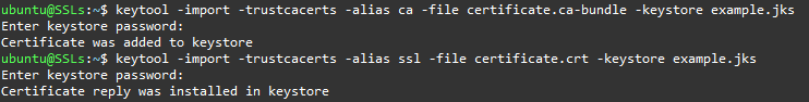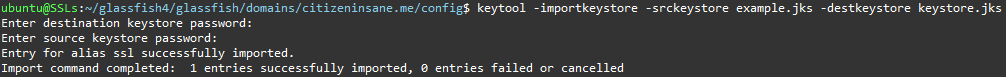 系统将提示您输入两个密钥库的密码,从目标密钥库keystore.jks开始。GlassFish密钥库的密码与域的GlassFish主密码相同; 默认情况下,它是changeit 。根据您用于导入的证书格式,将有不同数量的导入条目。如果您对密钥库和私钥使用了不同的密码,则还需要输入私钥密码。