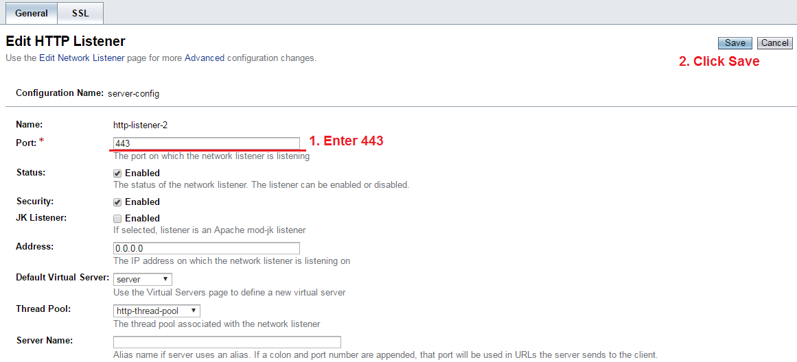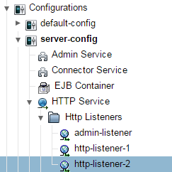 要通过GlassFish管理控制台启用证书,请进入以下菜单:配置> server-config> HTTP服务> HTTP侦听器> http-listener-2: