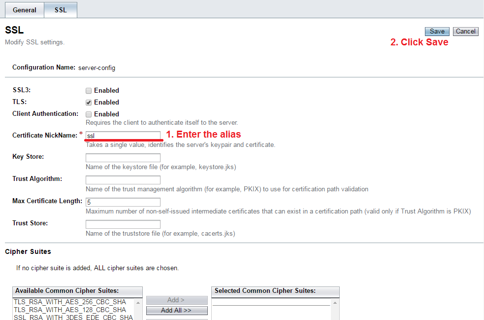 切换到“SSL”选项卡,输入您的证书别名myalias 作为证书NickName ,然后单击“保存”: