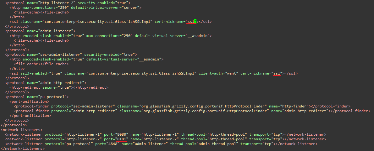 您可以使用适当的证书别名和端口手动编辑domain.xml配置文件,而不使用Web界面(GlassFish管理控制台)。该文件位于glassfish4 / glassfish / domains / domain1 / config / domain.xml中。