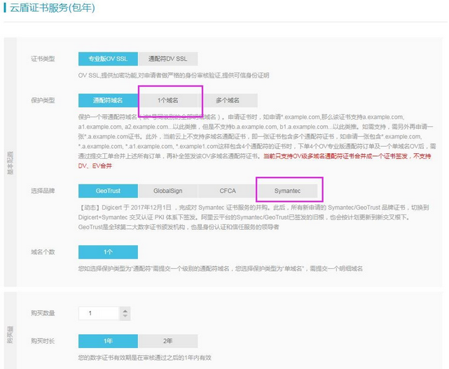 3、免费数字证书,最多保护一个明细子域名,不支持通配符,一个阿云帐户最多签发20张免费证书。