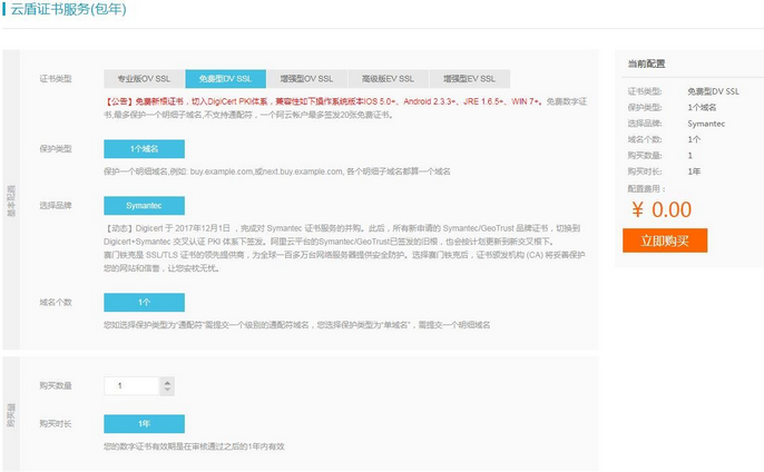 3、选择“免费型DV SSL”,然后选择购买数量后,点击立即购买。