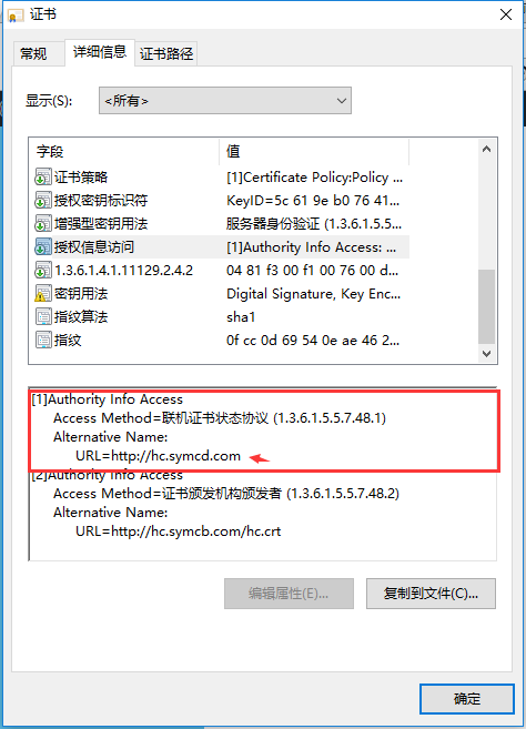 获取证书ocsp服务地址,找到证书公钥,在windows系统上面打开,当然也可以在浏览器上面查看,详细信息(显示-所有)–授权信息访问,如下图: