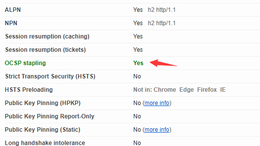 重启Nginx,ocsp stapling即可生效,可以通过https://www.ssllabs.com/ssltest/来进行检查,开启了ocsp stapling,检测结果ocsp stapling项是Yes表示已经成功开启,截图如下: