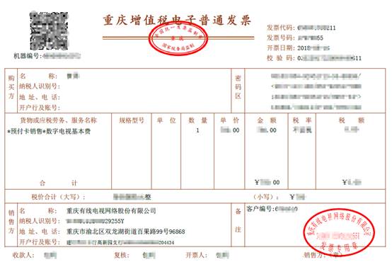 重庆有线电视网络股份有限公司(简称“重庆有线”,英文简写“CCN”),前身是重庆广播电视网络传输有限责任公司,是重庆市唯一具有国家广电总局颁发的有线广播电视传输资质的有线网络运营商。重庆有线响应国家税制改革要求,推行电子发票办理业务,为市民提供更加方便快捷、低碳环保的发票领取服务。