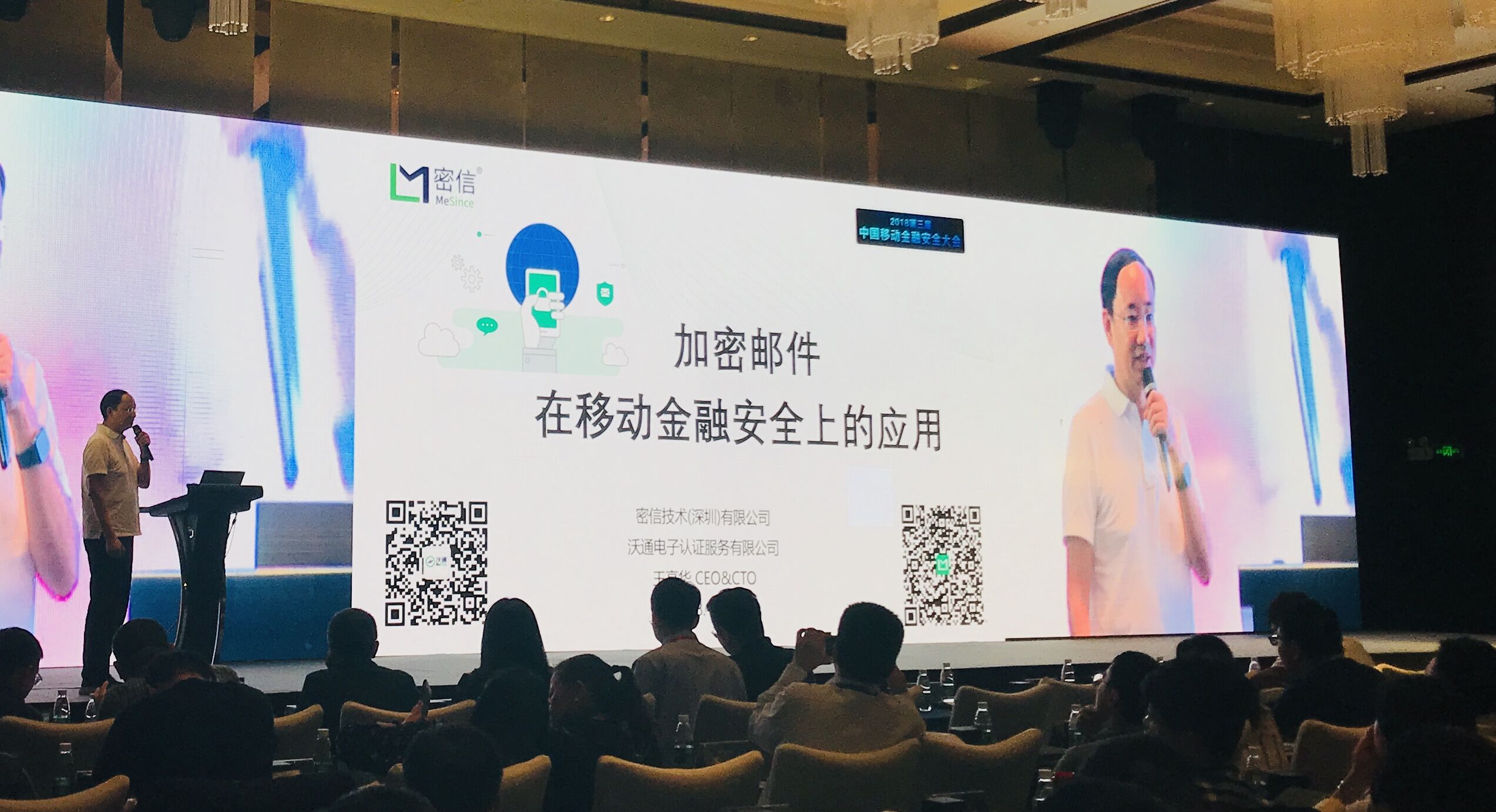 发布日期:2018-11-152018年11月15日,沃通CA携密信(MeSince)邮件加密解决方案(www.mesince.com)亮相2018中国移动金融安全大会。沃通CEO王高华先生在本届大会上发表了《加密邮件在移动金融安全上的应用》的主题演讲,共同聚焦移动金融交易安全与数据安全,探讨加密邮件在移动金融安全领域的应用。
