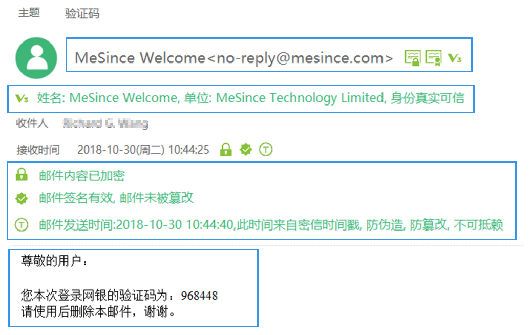 与短信验证码不同的是,邮件加密发送验证码,可以确保验证码在传输过程中全程加密,任何流量劫持或嗅探只能获取到加密密文,无法解密获取验证码,真正确保验证码的安全性和完整性;邮件发件人经过真实身份认证,直观展示发件人信息,可防止钓鱼邮件仿冒和欺诈。