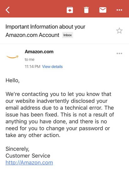 受影响用户在周三早上收到了亚马逊的电子邮件,提醒他们该公司“无意中”泄漏了他们的电子邮件地址。