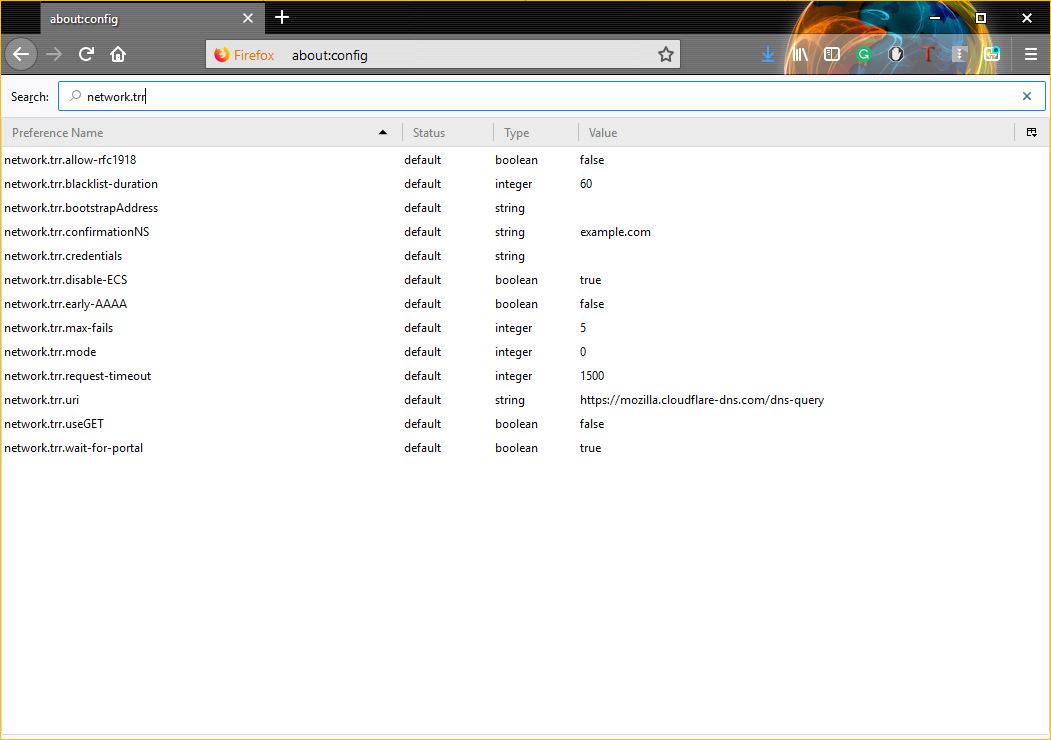 第二步:你需要启动Firefox的Trusted Recursive Resolver,这是DNS-over-HTTPS端点。为此,请在搜索字段中键入network.trr。