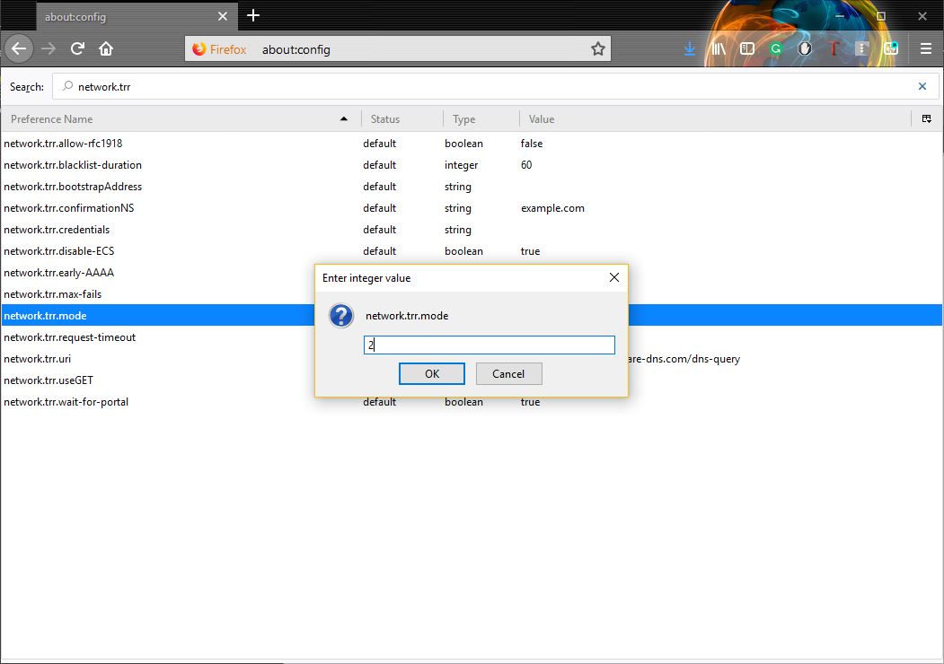 第三步:双击network.trr.mode,然后在字段中输入2并单击OK。