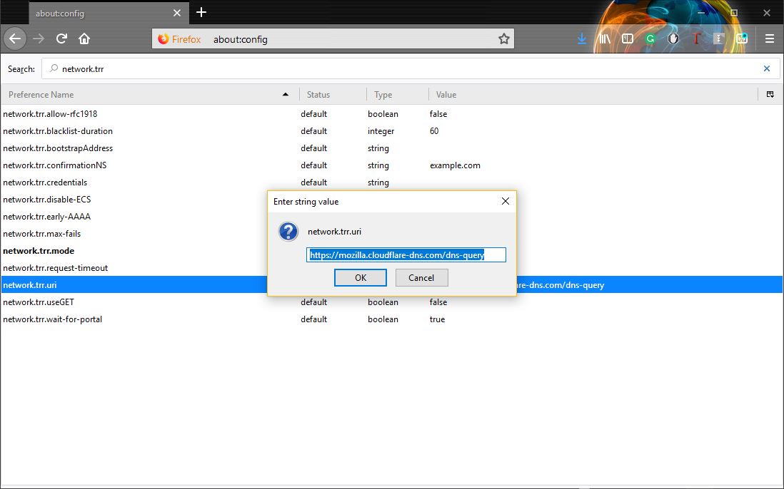 第四步:返回network.trr结果页面,选择network.trr.uri并将其设置为:https://mozilla.cloudflare-dns.com/dns-query