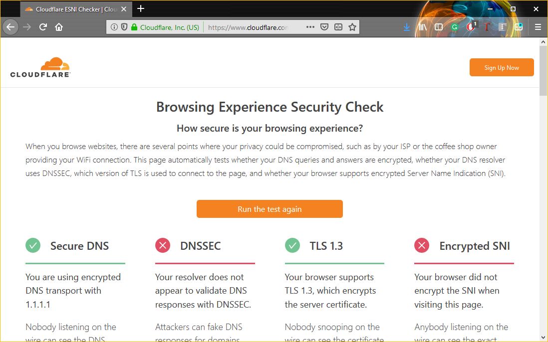 如果您想测试并确保一切正常,请转到Cloudflare的浏览体验安全检查页面 ,然后单击检查我的浏览器按钮。你应该看到一个漂亮的绿色复选标记,表明你正在使用安全DNS和TLS 1.3。