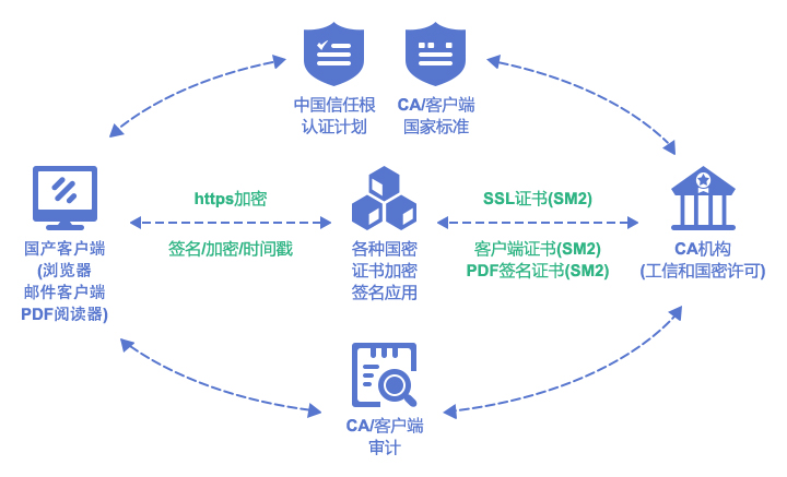 演讲中指出,目前我国在整个互联网基础生态体系中的国产化现状并不理想,而基于国产商用密码应用的可信生态建设是改变现状的突破口。密信提出“中国网络空间可信生态建设框架”构想,建议我国建立自己的信任根认证计划及CA /客户端国家标准、建立CA /客户端审计体系,并与遵循这套标准的国产客户端和CA机构共同建设可信生态圈,让国密算法真正实现落地各种国密证书加密与签名应用。
