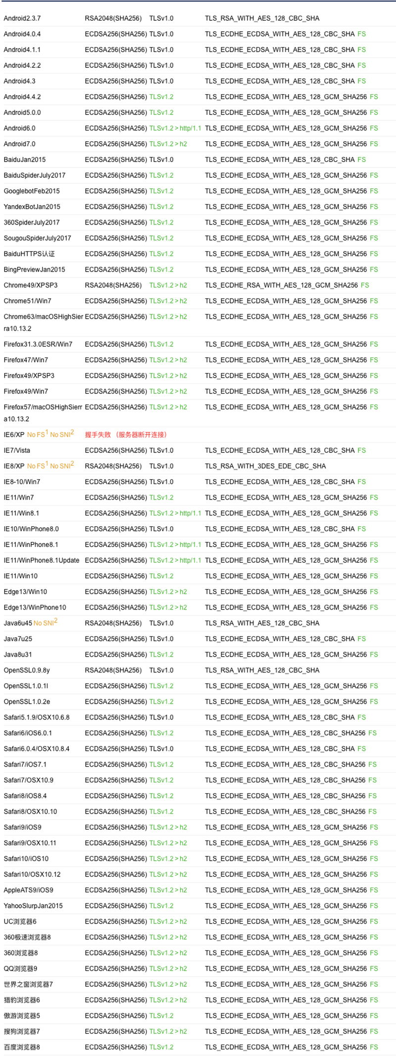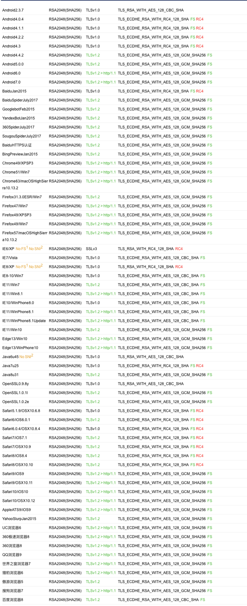 从这里发现哪怕用户使用的是IE6这款老古董级别的浏览器也能访问百度。这样的兼容性可以说是异常良好了。但是安全性就有点欠缺,如果要适配IE6这款浏览器,那么SSL协议就必须得支持SSL2和SSL3,因为IE6支持也仅支持这两个协议,SSL2是明确说明不安全的了,SSL3上又有著名的POODLE漏洞问题,SSL3上的所有CBC加密套件都会受该漏洞影响,除去CBC加密套件,那么就只剩下RC4系列的加密套件了,这个没得选择。