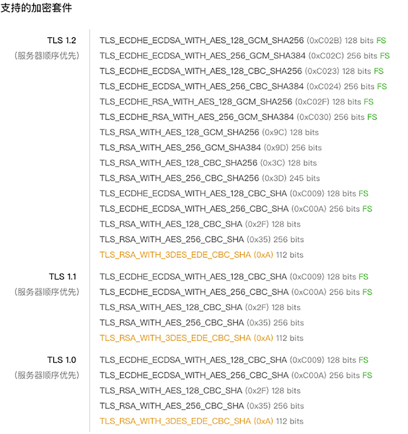 但是那个黄色的TLS_RSA_WITH_3DES_EDE_CBC_SHA又是什么原因呢?这是为了兼容XP上的IE8这类浏览器,这些浏览器器支持加密套件基本都是不安全的,唯一比较安全的就是3DES系列的了。为了兼容这些浏览器这应该算是一种比较好的方式了。