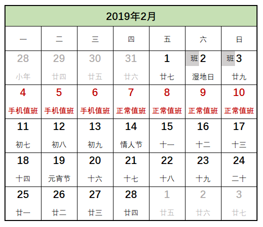 春节假期:2019年2月4日—2月10日,共7天。其中,4日(除夕)至6日(初二)将安排值班人员手机值班,7日(初三)至 10日(初六)均安排正常值班。