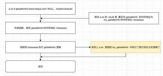 这样,a.so 在实际运行时会被拐到我们的 my_getaddrinfo 中?