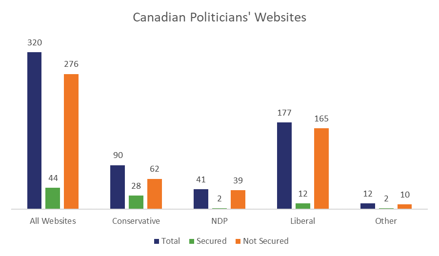 超过86%的加拿大政客拥有不安全的网站。在接受调查的320个网站中,有276个网站没有安全保障,其中最安全的一方是保守派,其中三个网站中仍有超过两个使用HTTP。