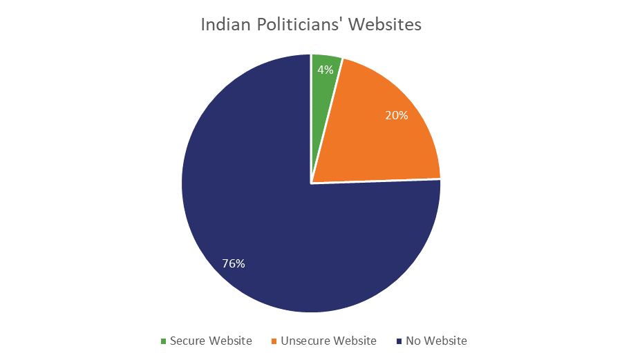 印度政治家数量惊人,但根本没有任何网站。在接受调查的887名印度政客中,有670人完全没有网站。拥有网站的政客们也并没有使用SSL / TLS证书来保护他们。只有16.13%拥有网站的印度政客通过HTTPS提供服务,近84%的人没有。