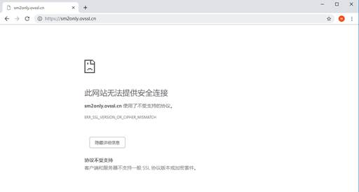 建立完整的国密应用生态闭环,可以确保国密SSL证书在国密浏览器中正常使用,但这还远远不够。如果用户使用不支持国密的主流浏览器访问国密SSL证书网站,仍然会出现不受信任和无法访问的问题,国密SSL证书应用方案无法兼容主流应用生态,在实际应用中将很难真正落地实施。下图为使用Chrome浏览器访问国密SSL证书网站(单证书部署)的显示效果。