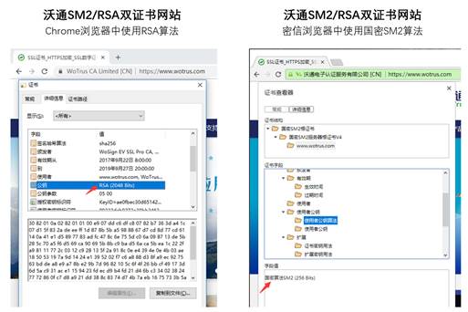 为此,沃通独家推出“SM2/RSA双证书”服务和“自适应兼容浏览器”的应用模式,双证书、双算法,自适应兼容国密浏览器和国际主流浏览器,兼顾国密合规性和全球通用性。