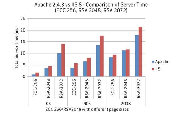 在TLS握手过程中,更长的密钥意味着必须来回发送更多的数据以验证连接,产生更大的性能损耗和时间延迟。因此,ECC算法能够以较小的密钥和较少的数据传递建立HTTPS连接,在确保相同安全强度的前提下提升连接速度。经国外有关权威机构测试,在Apache和IIS服务器采用ECC算法,Web服务器响应时间比RSA算法快十几倍。