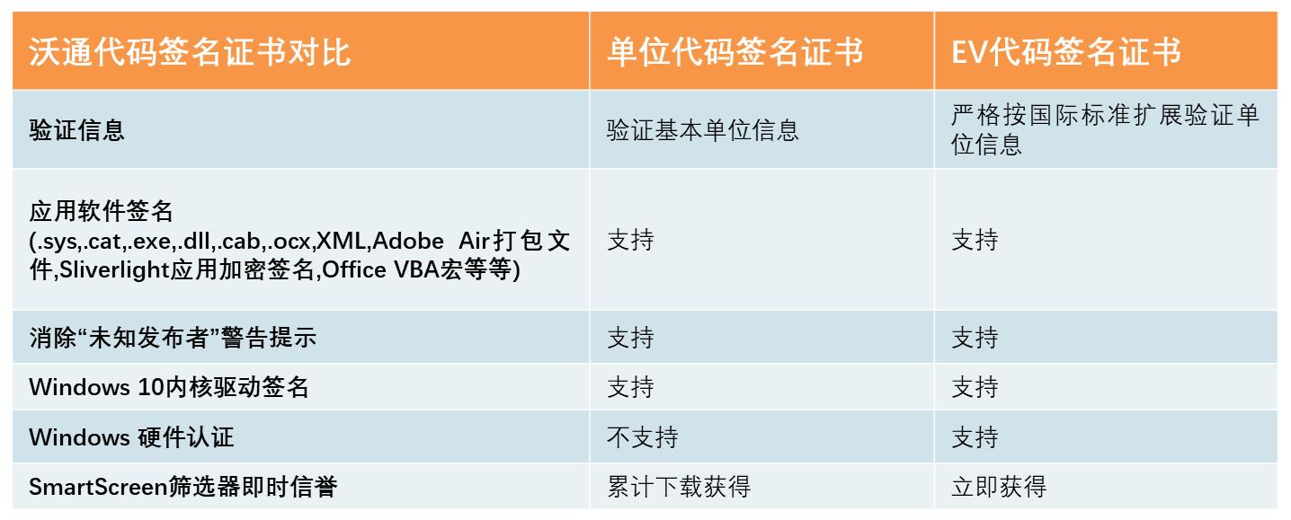 两类代码签名证书都需要验证软件开发机构的单位真实身份,都支持多用途的普通代码签名,但沃通EV代码签名证书需要遵循更加严格的扩展验证标准,并采用更安全的私钥存储方式( USB Key硬件存储),也具备更丰富的应用功能,EV代码签名证书支持Windows硬件认证(即徽标认证),可以用它建立Windows硬件开发人员中心仪表板账号,并支持在Windows SmartScreen筛选器中快速建立信誉,让程序流畅运行。
