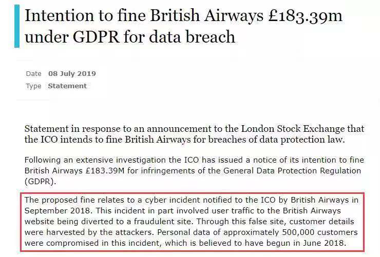发布日期:2019-07-25今年7月8日,英国信息专员办公室(ICO)决定,对去年英国航空50万用户信息泄露一事开出1.83亿英镑(约合人民币15.8亿元)的罚单。这是欧盟《通用数据保护条例》(GDPR)生效以来的最高金额罚单,约占英国航空2018年收入的1.5%。