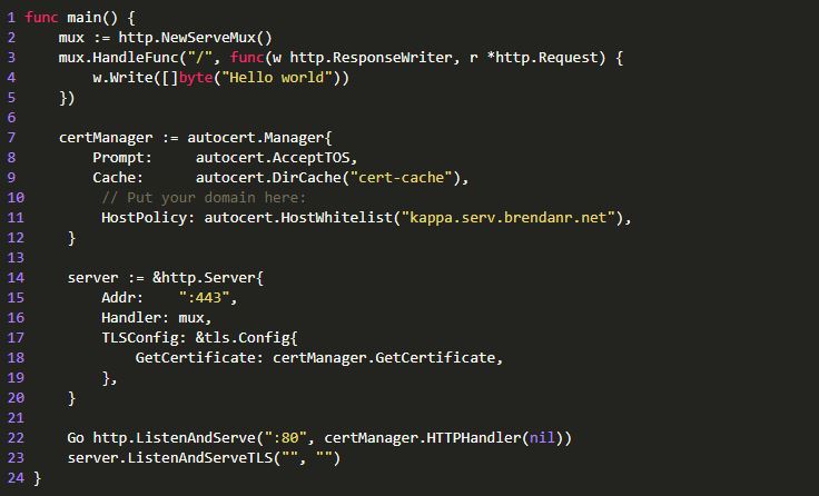 最后,您需要使用上文提到的acme/autocert包来请求和响应ACME请求。Krzysztof Kowalczyk提供了一个很好的示例,您可以阅读它,但我将向您展示一个为更简单的版本以便更好地解释它是如何工作的。