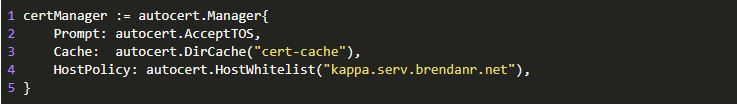 上述代码为ACME相关配置信息。Prompt: autocert.AcceptTOS字段意味着您接受了Let's Encrypt的服务条款。Cache字段指定autocert包是否缓存以及缓存证书的方式。Let's Encrypt存在请求速率限制,限制了您申请证书的频率,因此将证书存储在后续可以检索的地方非常重要。这里我们指定证书存储在 cert-cache 目录中。最后,HostPolicy 字段允许我们将期望申请证书的域名加入白名单。如果没有该设置,攻击者可能会耗尽所分配的速率限额,并可能会阻止您生成所需的证书,因此配置该字段很重要。