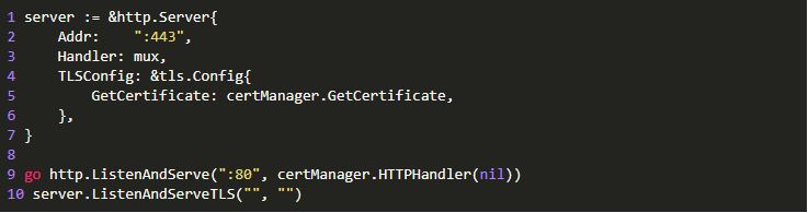 最后,我们配置并启动HTTP和HTTPS服务。HTTPS服务将使用我们之前编写的处理程序进行响应。在响应HTTPS请求时,会自动获取HTTPS证书(来自缓存或 Let's Encrypt)。HTTP服务专门用于允许Let's Encrypt对我前面提到的秘钥令牌发出请求。也可以将HTTP服务重定向到HTTPS--请查看之前的示例。